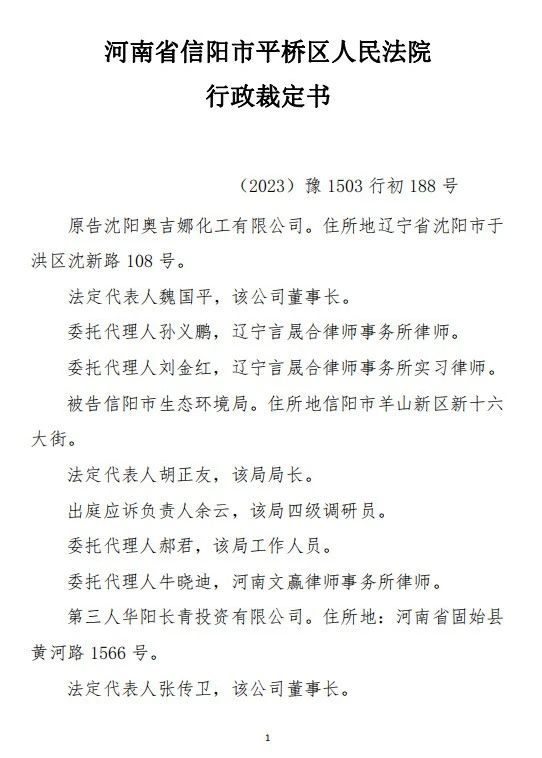 中國風電潤滑油民營企業(yè)沈陽奧吉娜化工有限公司(下簡稱:奧吉娜公司或原告)訴信陽市生態(tài)環(huán)境局(被告)和第三人華陽長青投資有限公司(下簡稱:華陽長青公司)行政訴訟案,河南省信陽市平橋區(qū)人民法院于2023年12月29日作出行政裁定:駁回原告沈陽奧吉娜化工有限公司的起訴。