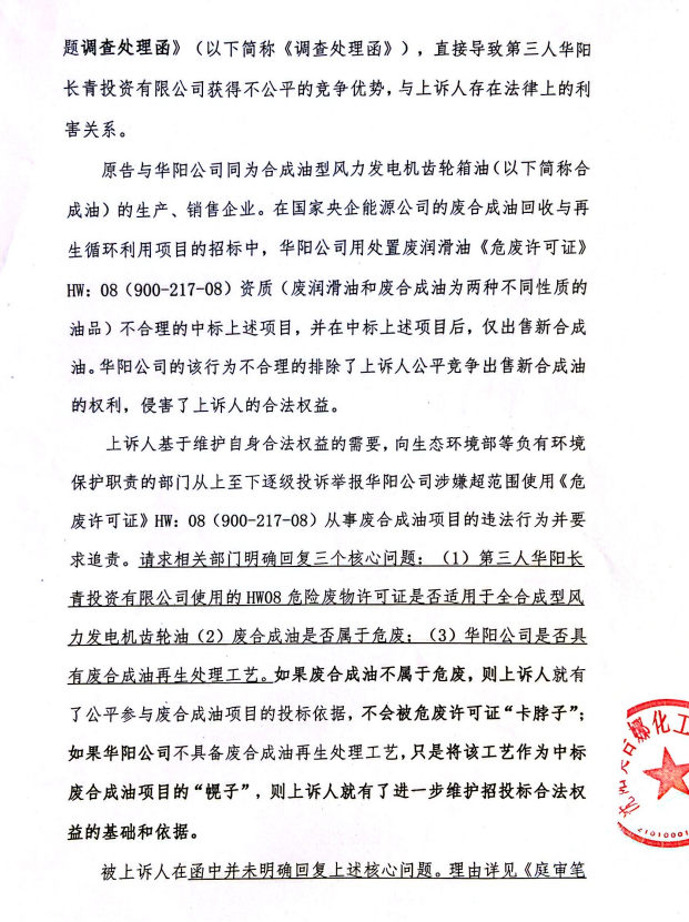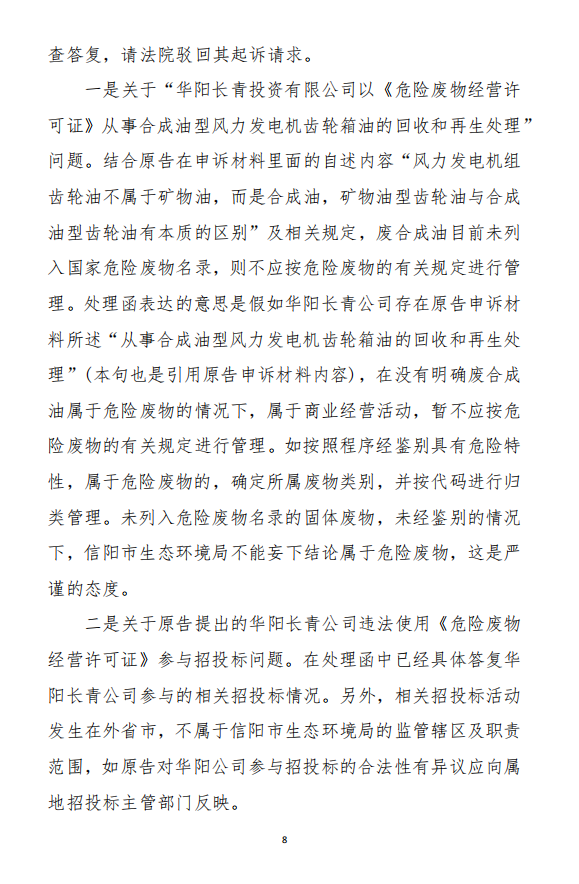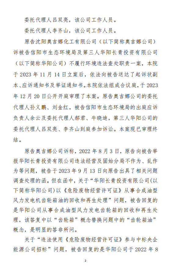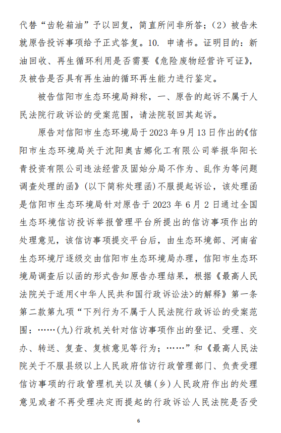 2、訴訟請求:請求人民法院判決撤銷被告作出的《信陽市生態(tài)環(huán)境局關于沈陽奧吉娜化工有限公司舉報華陽長青投資有限公司違法經營及固始分局不作為、亂作為等問題調查處理的函》;責令被告對原告向被告舉報華陽長青投資有限公司事項,限期進行重新調查和答復;判令被告認定的廢合成油不應按危險廢物有關規(guī)定進行管理違反法律規(guī)章規(guī)定,無效。