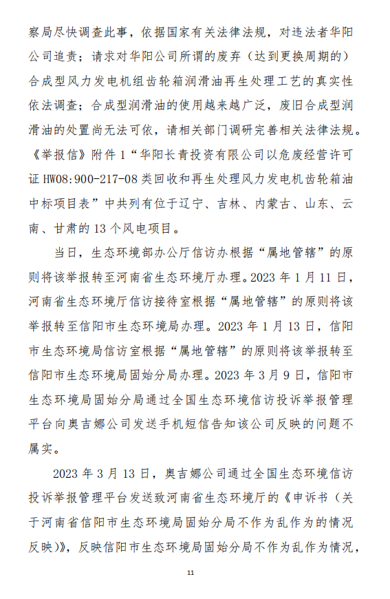 2023年3月9日,奧吉娜公司收到固始分局通過12369環(huán)境信訪平臺的短信答復:“反映問題不屬實”。3月10日,奧吉娜公司向固始分局負責人電話詢問,其解釋稱:經調查核實,華陽長青公司沒有再生風電潤滑油銷售,出售的是新油。否定了奧吉娜公司的舉報內容。對此,奧吉娜公司表示強烈不滿。3月11日,奧吉娜公司向環(huán)境部投訴固始分局的不作為和亂作為。