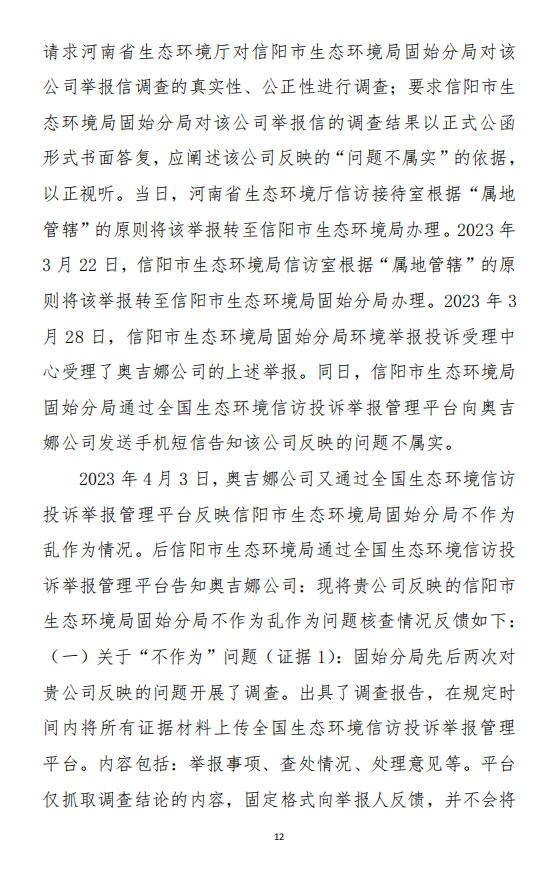2023年8月3日,奧吉娜公司向河南省生態(tài)環(huán)境廳(以下稱:環(huán)境廳)舉報信陽環(huán)境局包庇固始分局的行為。環(huán)境廳對此高度重視,有關處長和奧吉娜公司負責人進行了面談。