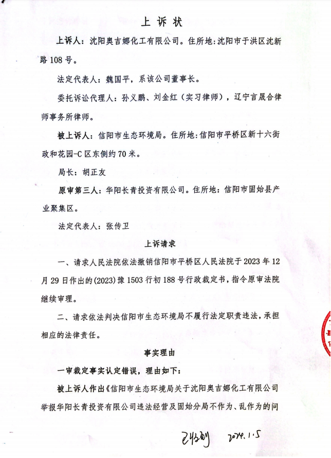 2024年1月5日,沈陽奧吉娜公司不服河南省信陽市平橋區(qū)人民法院的裁定,上訴至河南省信陽市中級人民法院。