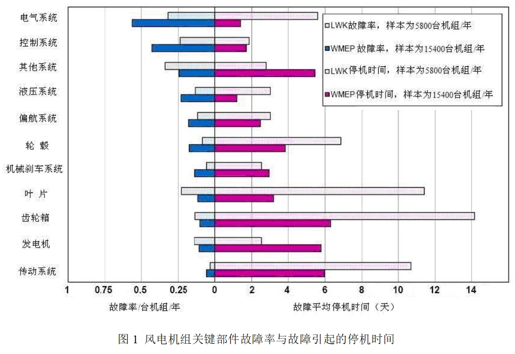 據風電機組主要零部件可靠性研究表明,在風電機組的故障中電氣和控制系統故障率最高,齒輪箱故障率相對較低,但通過進一步統計顯示,電氣和控制系統的故障容易排除,停機時間短,而齒輪箱引起的故障難以排除,費用大并造成長時間停機,最長達到半月之久(詳見圖 1)。
